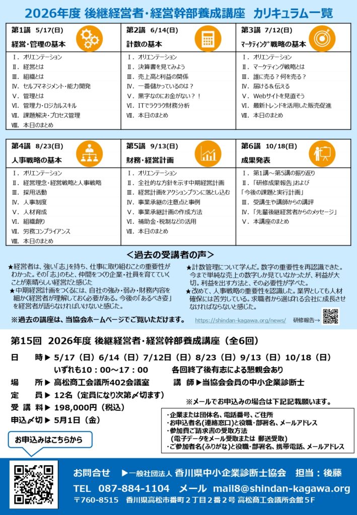香川県中小企業診断士協会が、2011年から開催しております「後継経営者・経営幹部養成講座」。 今年で15回目の開催となりました。
